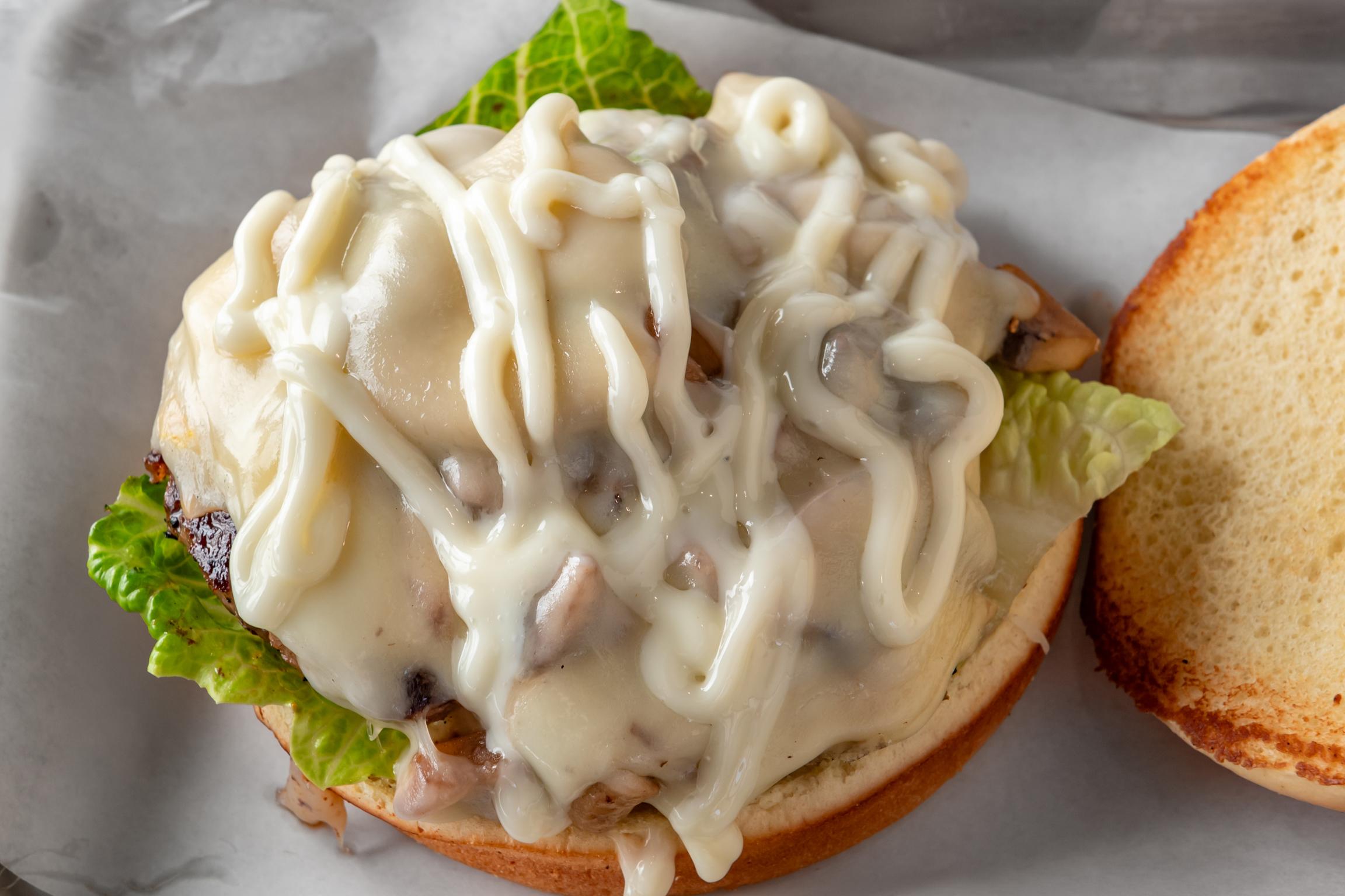 BEEF BURGER WITH LETTUCE, TOMATO, ONION, SWISS CHEESE AND TOPPED WITH MUSHROOMS & MAYO