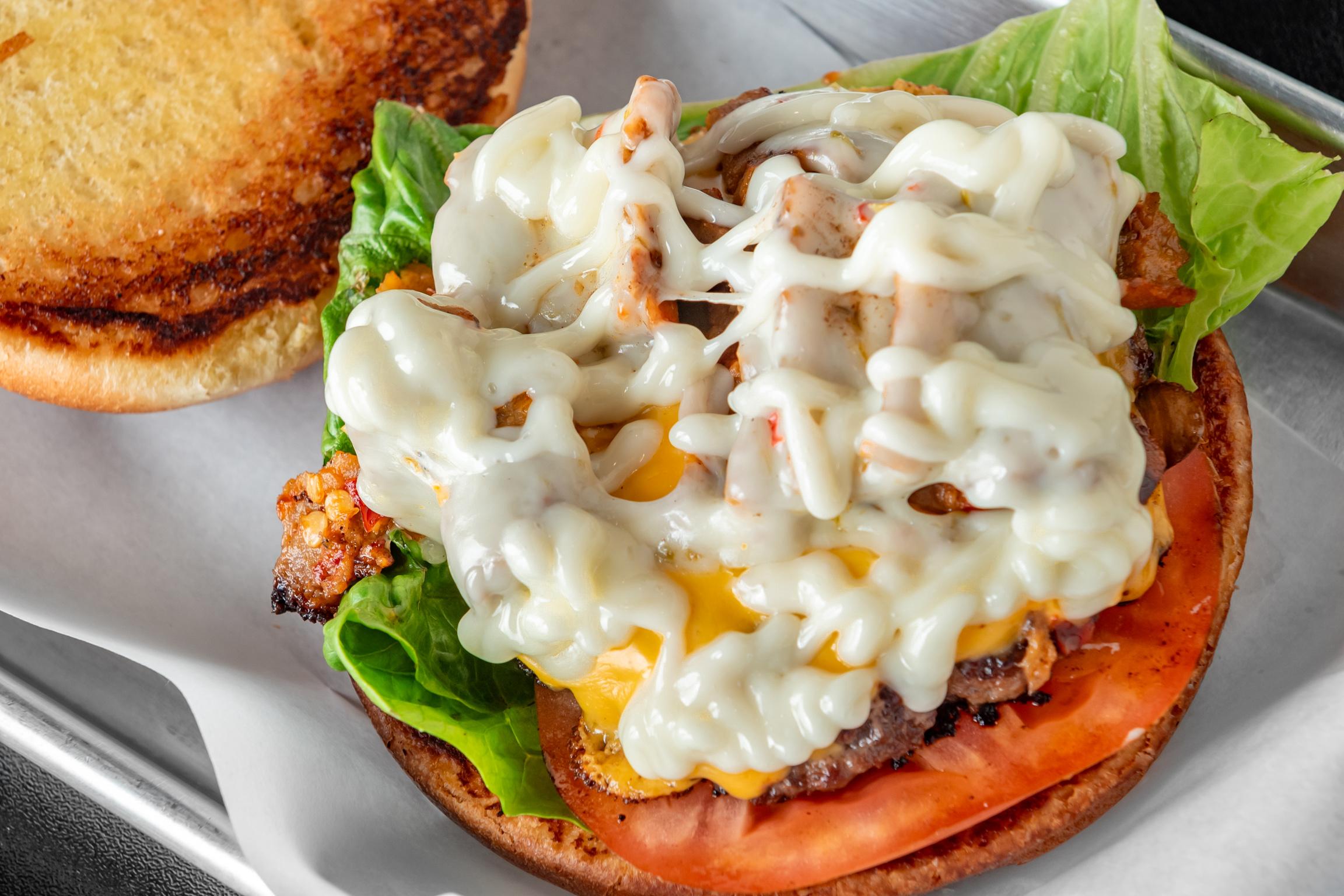 CHEESEBURGER WITH LETTUCE, TOMATO, ONION, AMERICAN CHEESE AND TOPPED WITH SPICY GYROS, MELTED PEPPER JACK CHEESE & MAYO